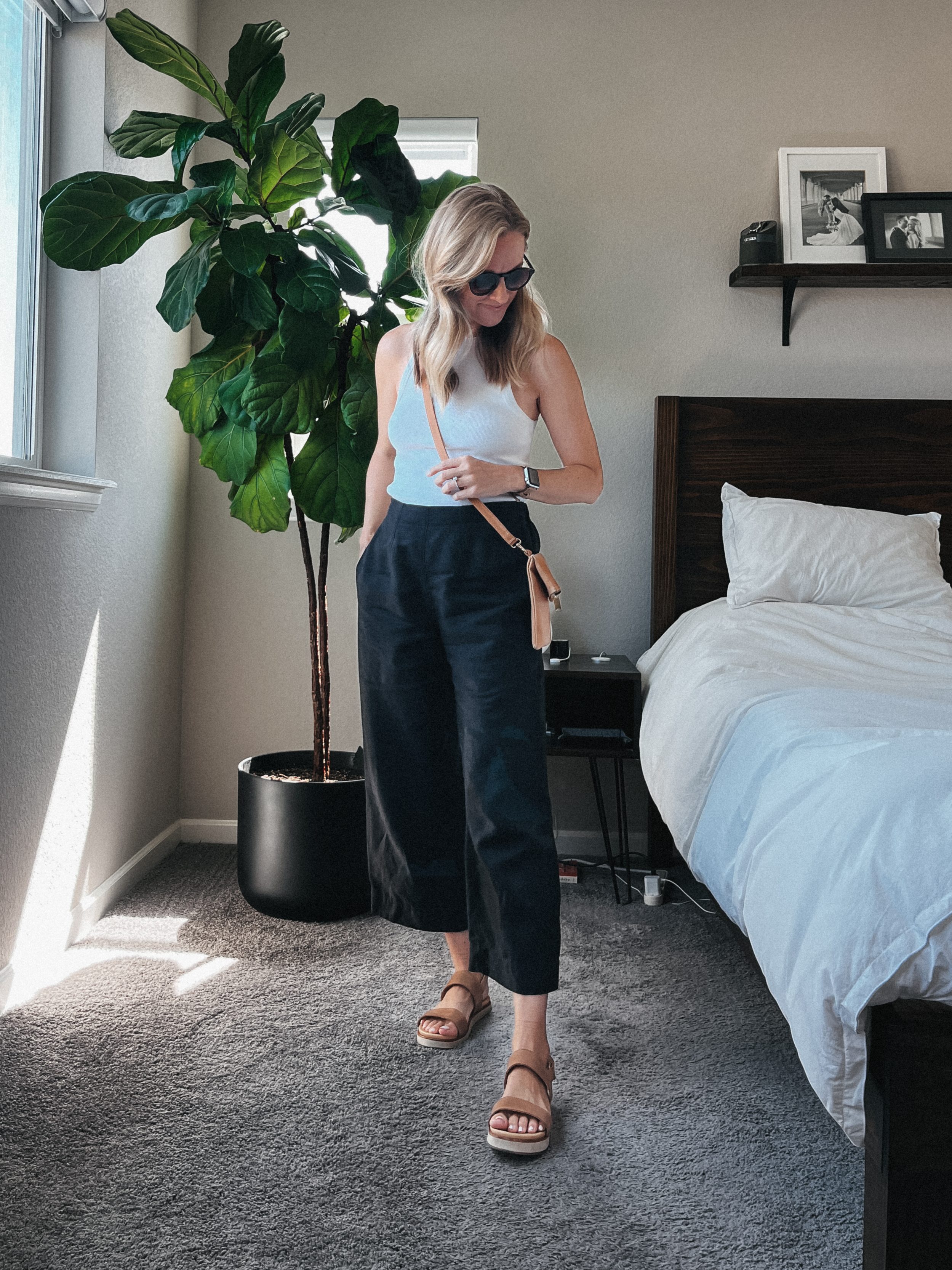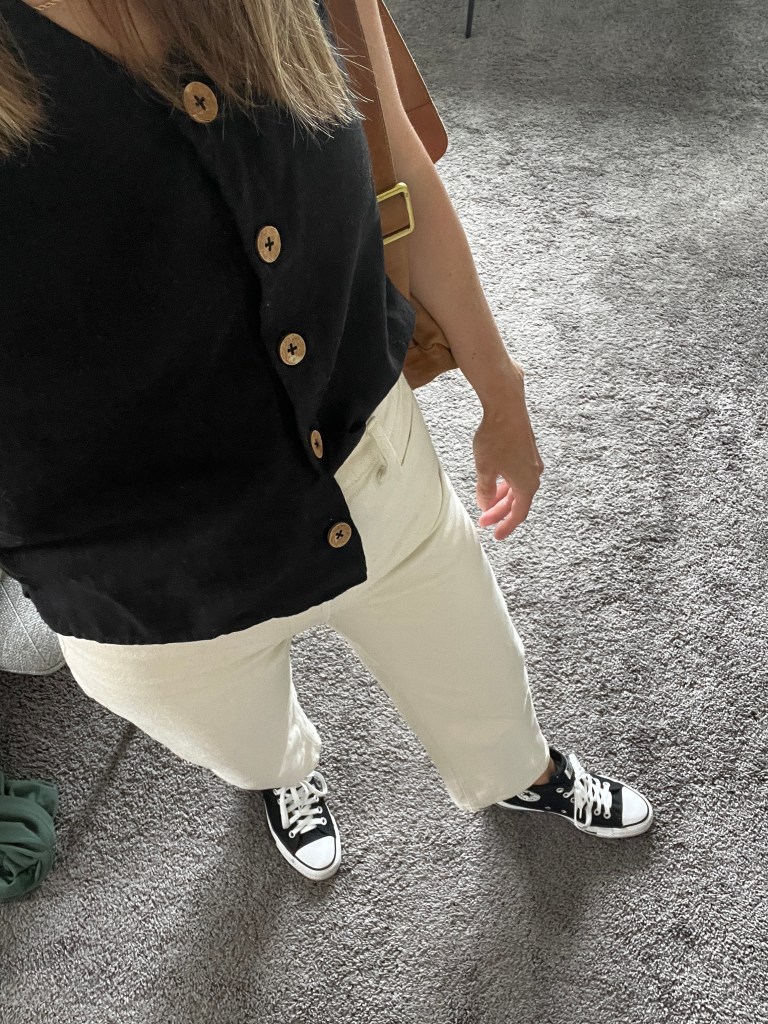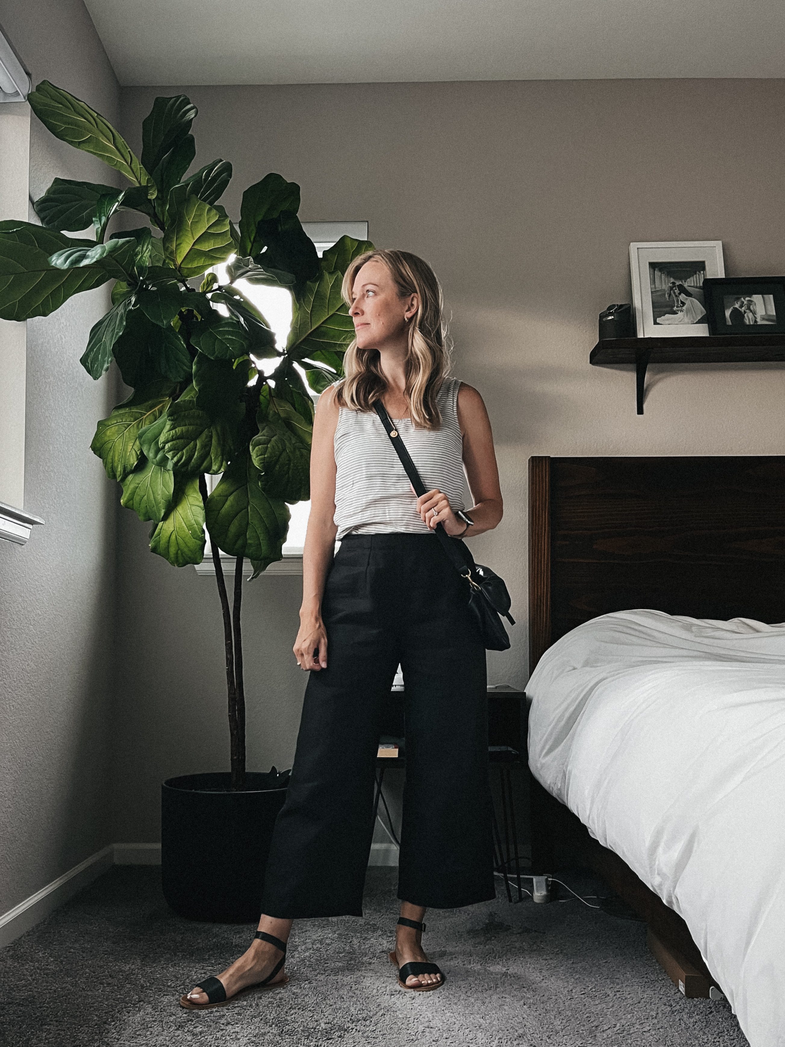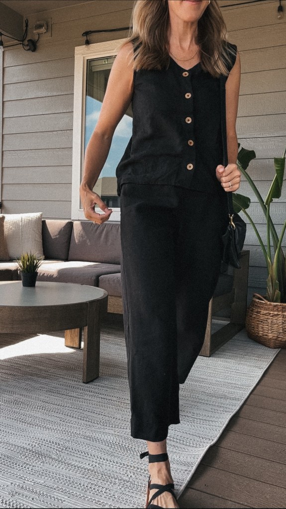 But to add to my case, consider that it’s so simple to mix and match other pieces from a capsule wardrobe to make an unlimited amount of outfits. See a few outfits I made below using the linen tank and linen trousers from my matching set:
