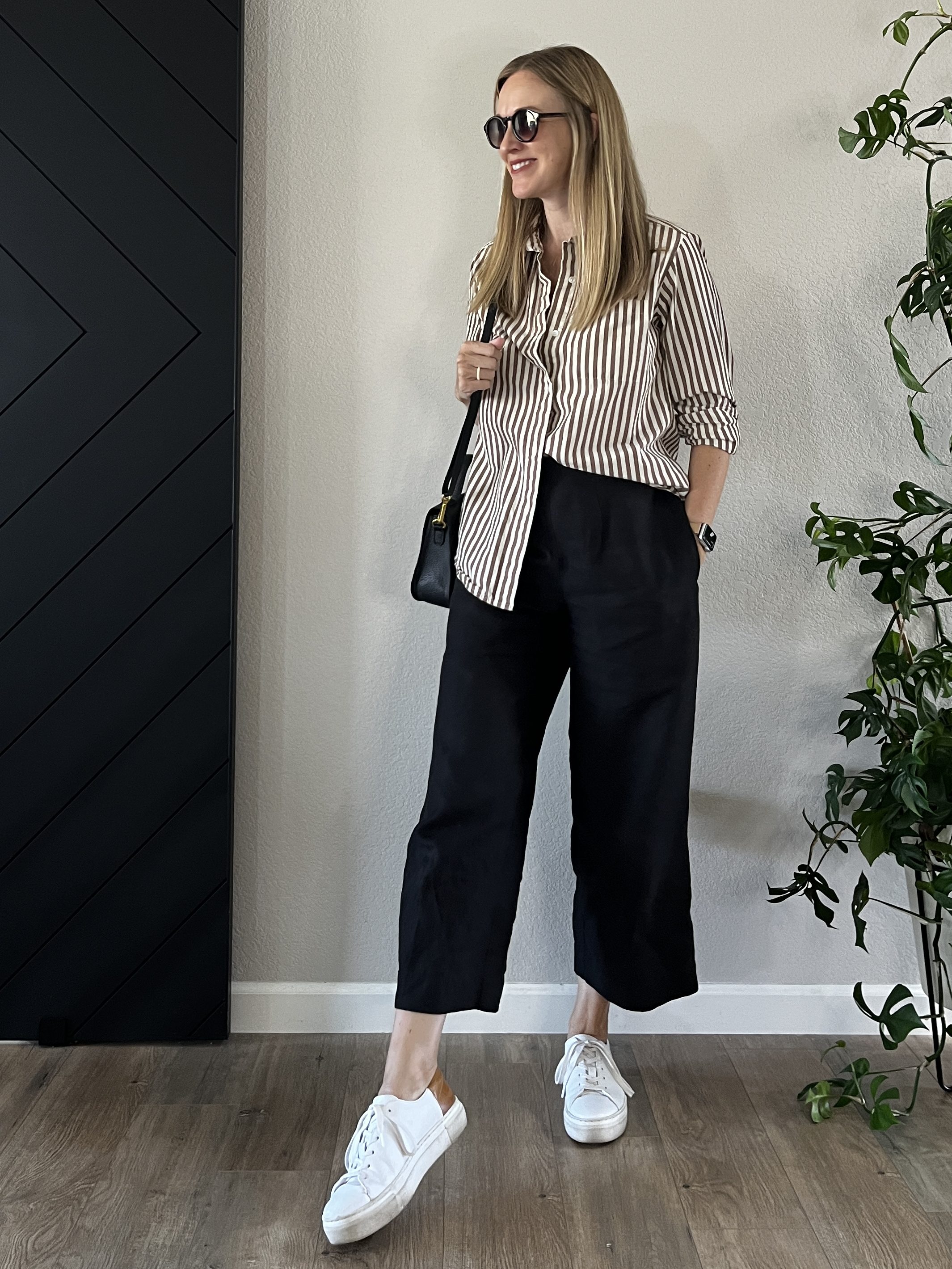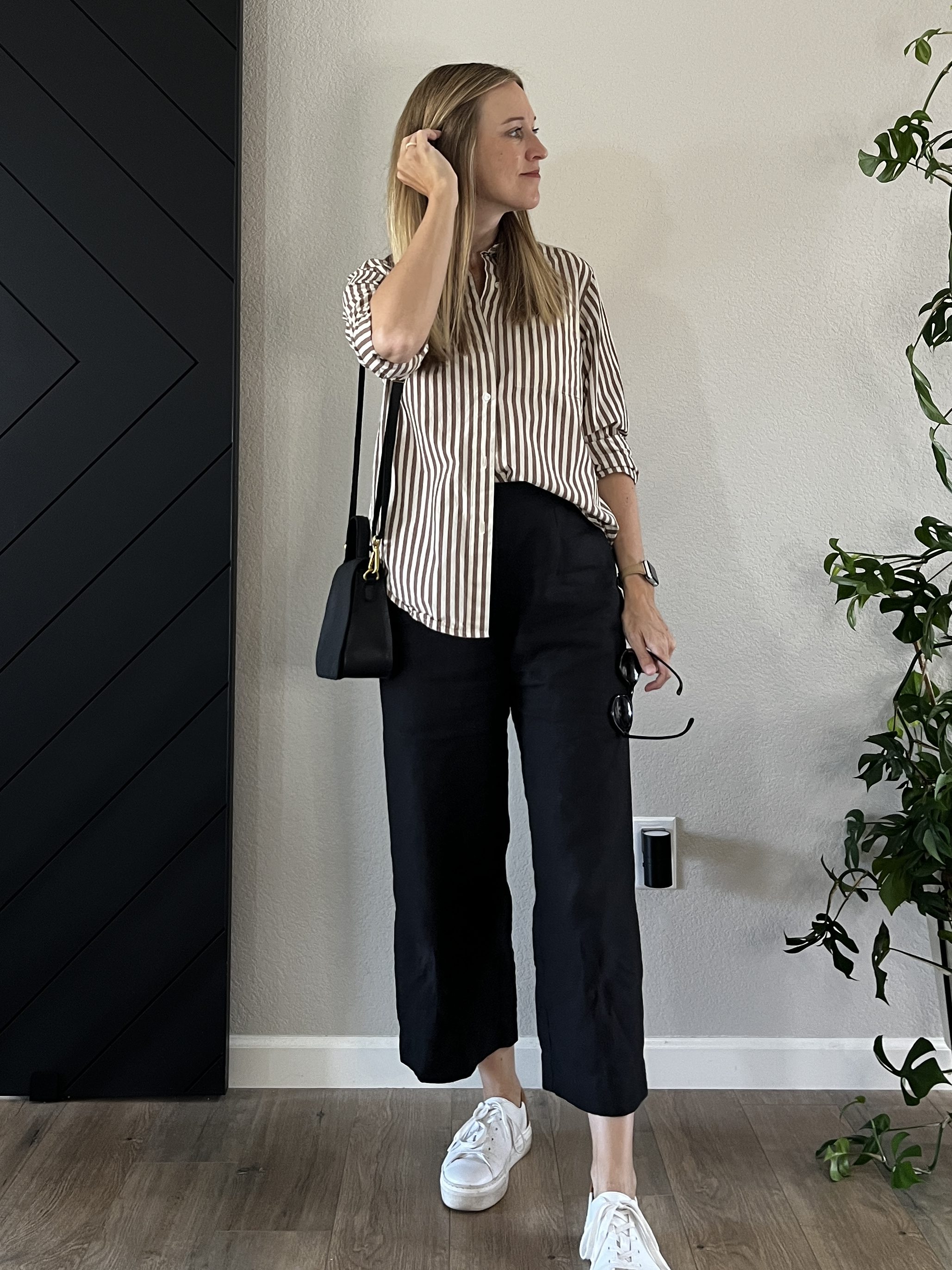Striped Button Down Shirt | Cropped Linen Trousers (20% off with code KIMBERLY20) | Black Shoulder Bag | White Sneakers | Necklace