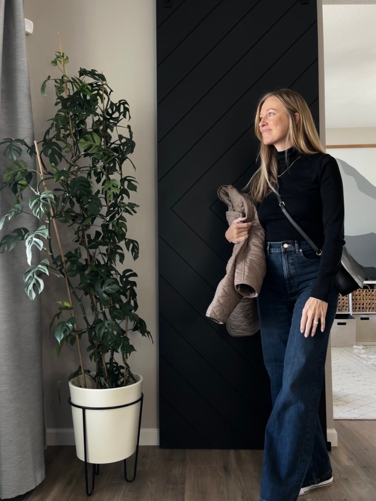 Black Turtleneck | Quilted Jacket | Wide Leg Jeans | Black Belt | Converse Hightops | Necklace | Hoop Earrings | Black Purse