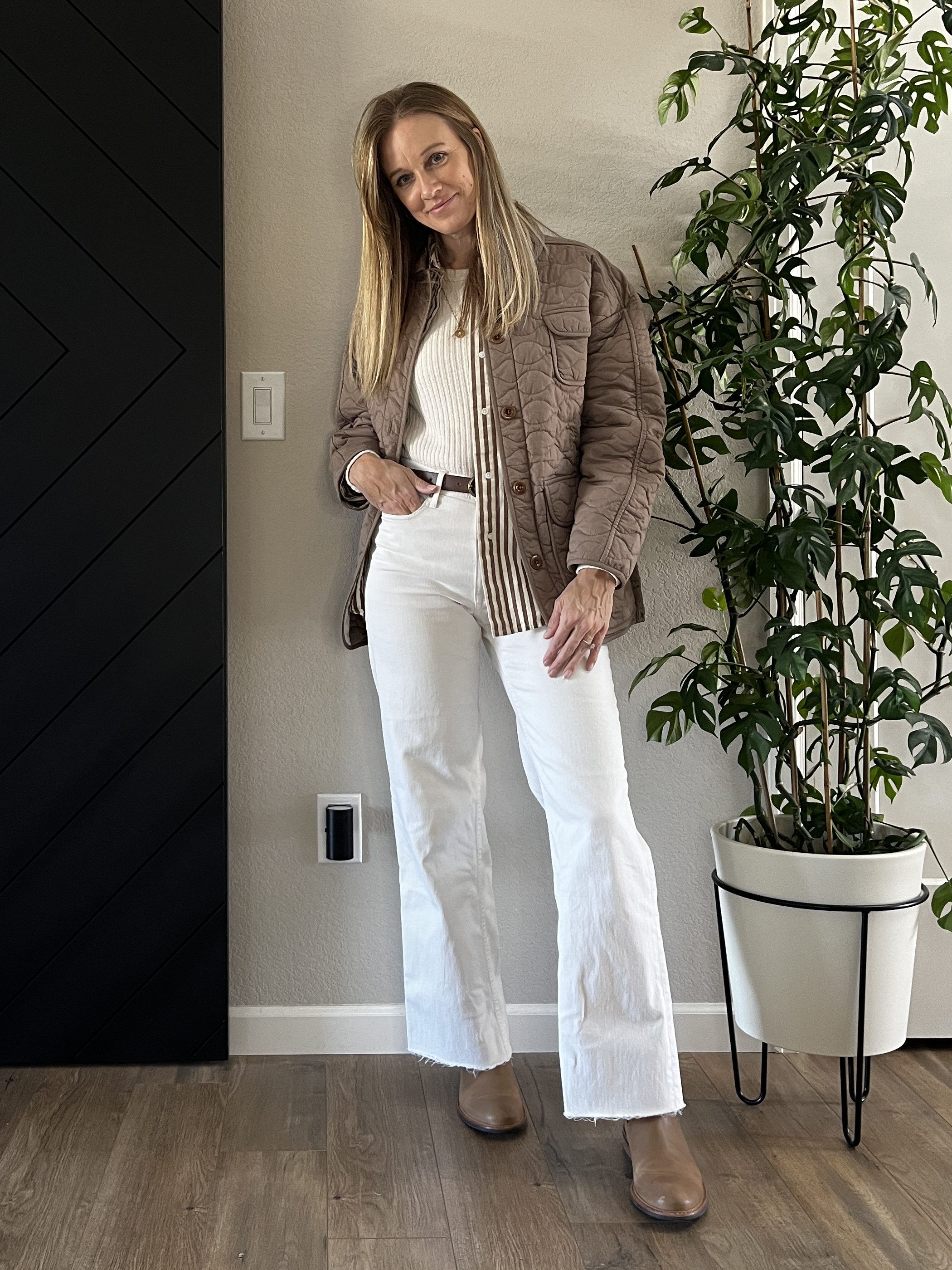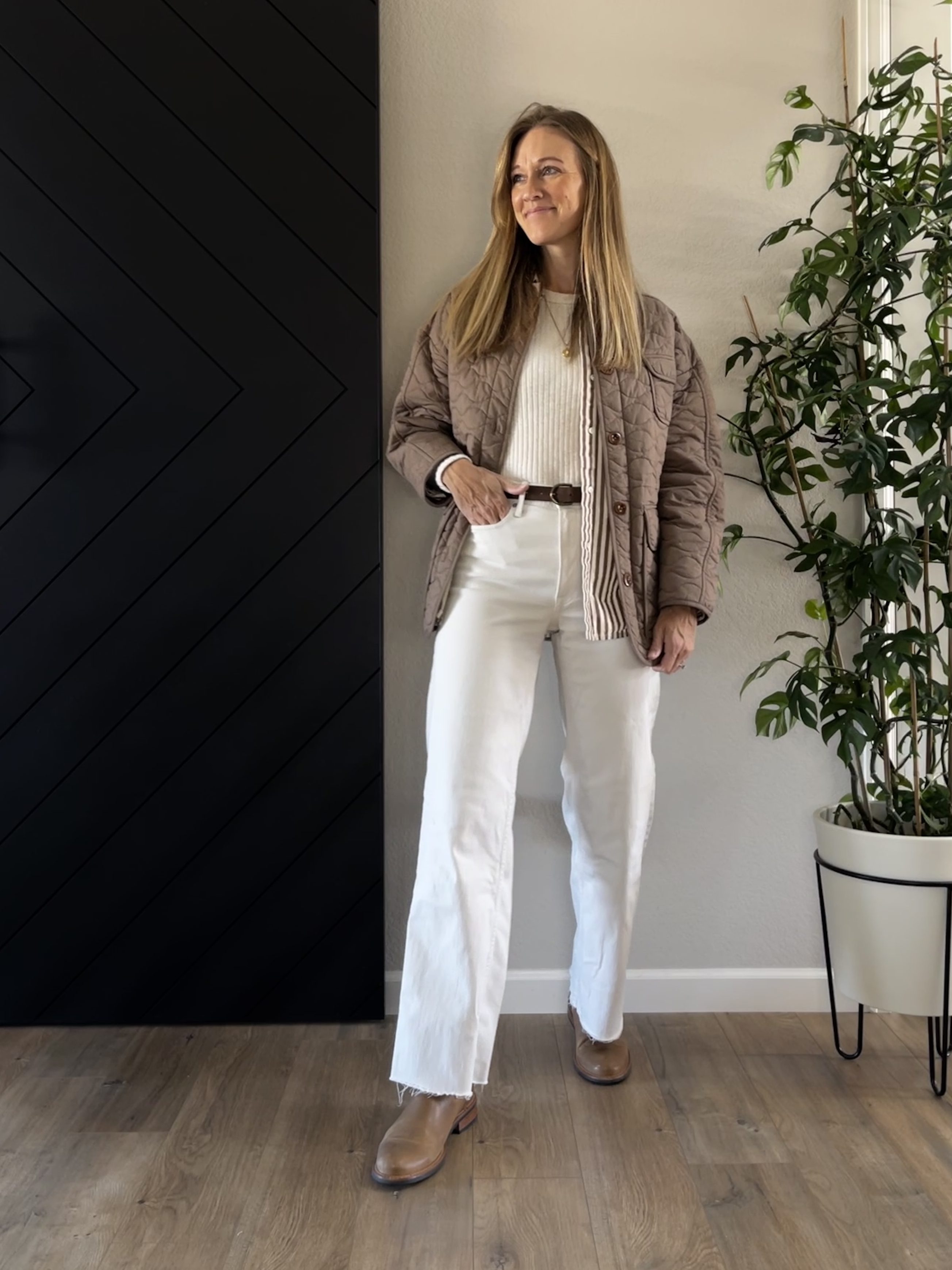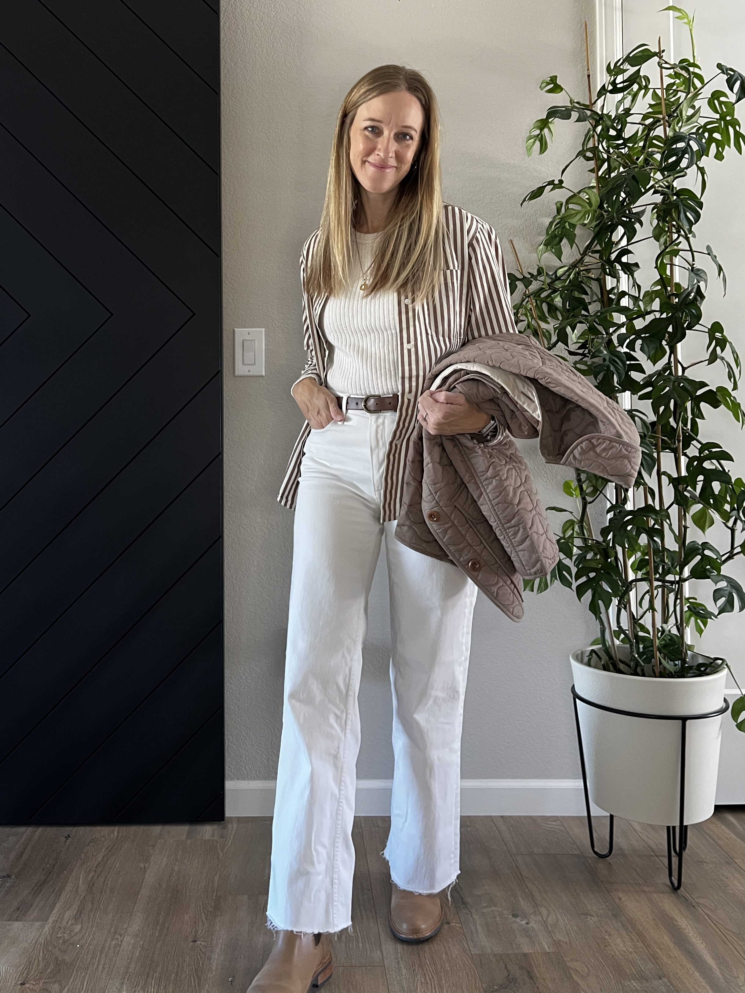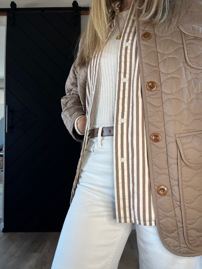 Cream Ribbed Long Sleeve Shirt | Striped Button-down Shirt | Quilted Jacket | White Jeans (similar) | Brown Belt | Chelsea Boots | Grit Charm Necklace