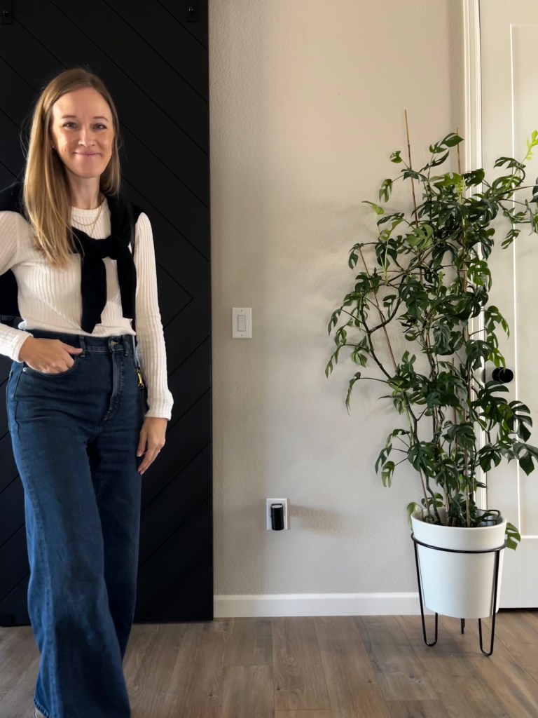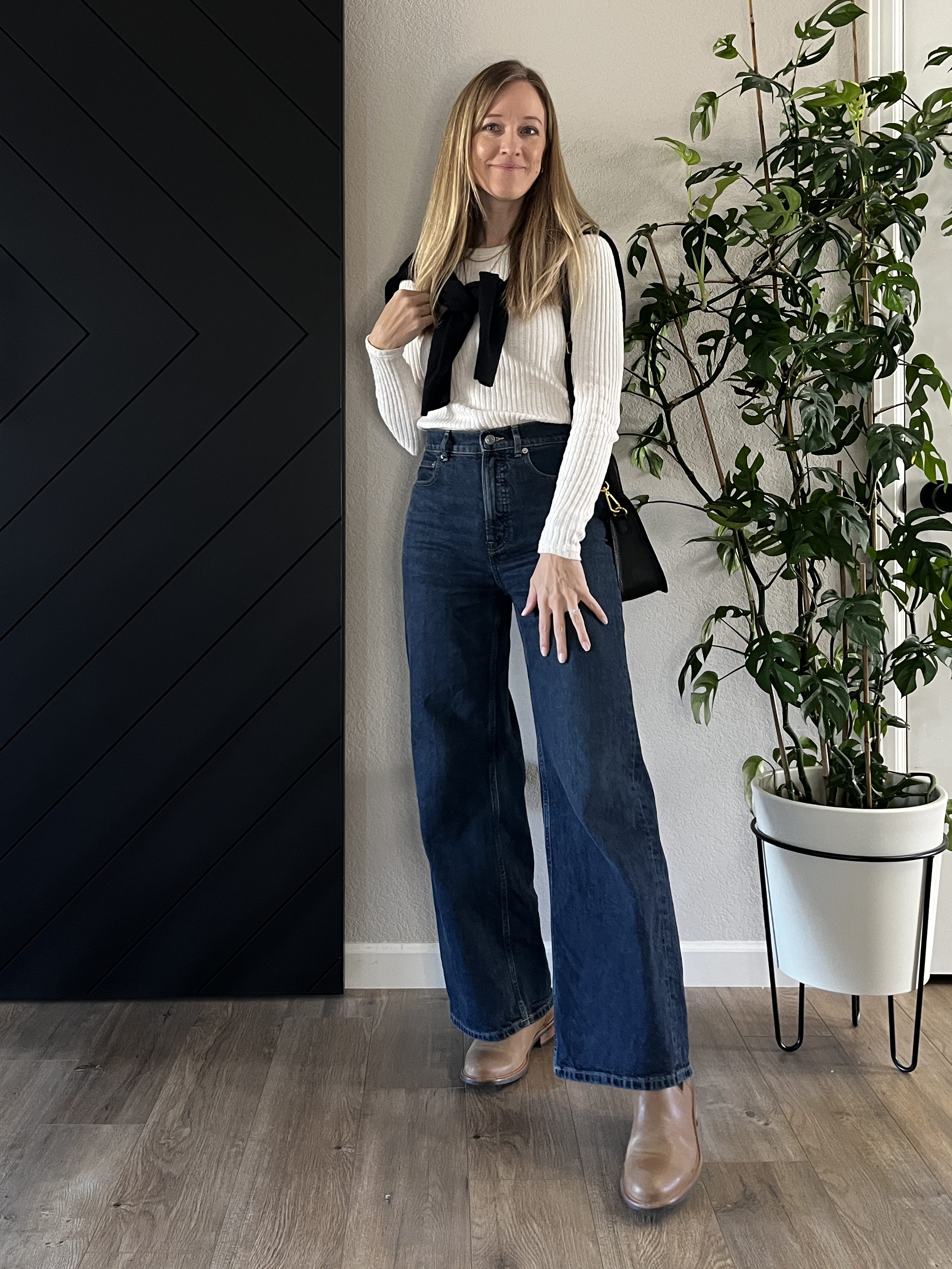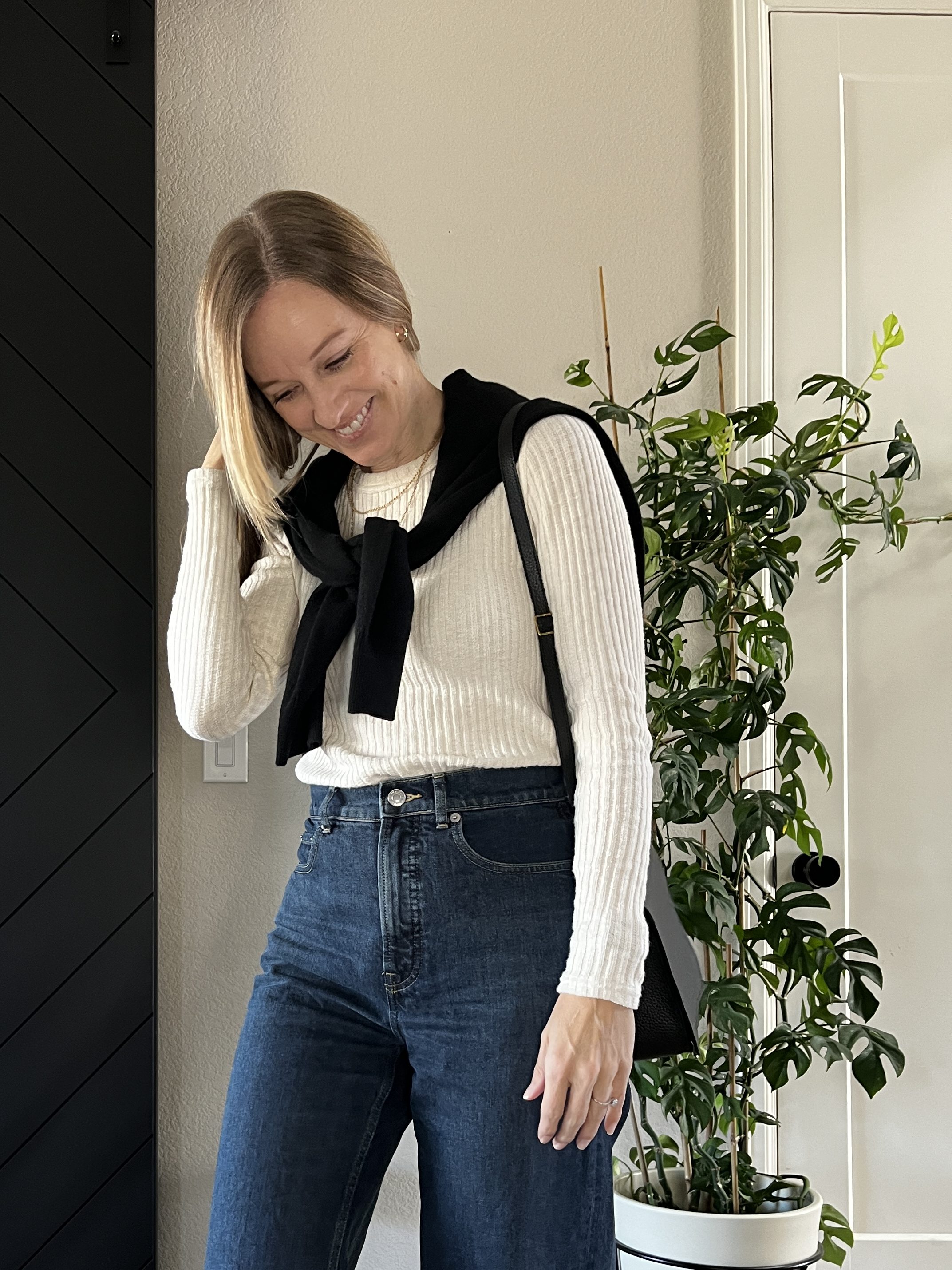 Cream Ribbed Long Sleeve Shirt | Cashmere Sweater | Wide Leg Jeans | Black Purse | Chelsea Boots | Grit Charm Necklace