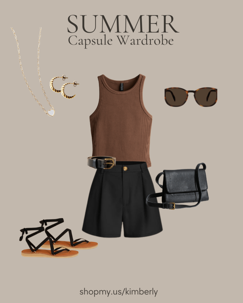 - Tank Top + Button-down (left open) + High-waisted Shorts